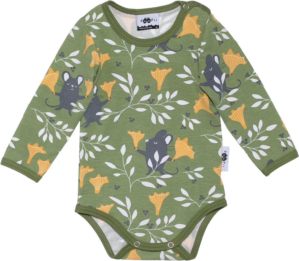 PaaPiin vihreä vauvan body sävyssä neva. Kotimaisessa vauvan bodyssa on pitkät hihat, jotka pitävät vauvan lämpimänä. Olalla ja haaroissa on pukemista helpottavat nepparit. Luomupuuvillainen body on malliltaan istuva, ja siinä vauvan on mukava leikkiä, levätä ja oppia uutta. Yhdistä bodyn kanssa esimerkiksi PaaPiin Baby legginsit.