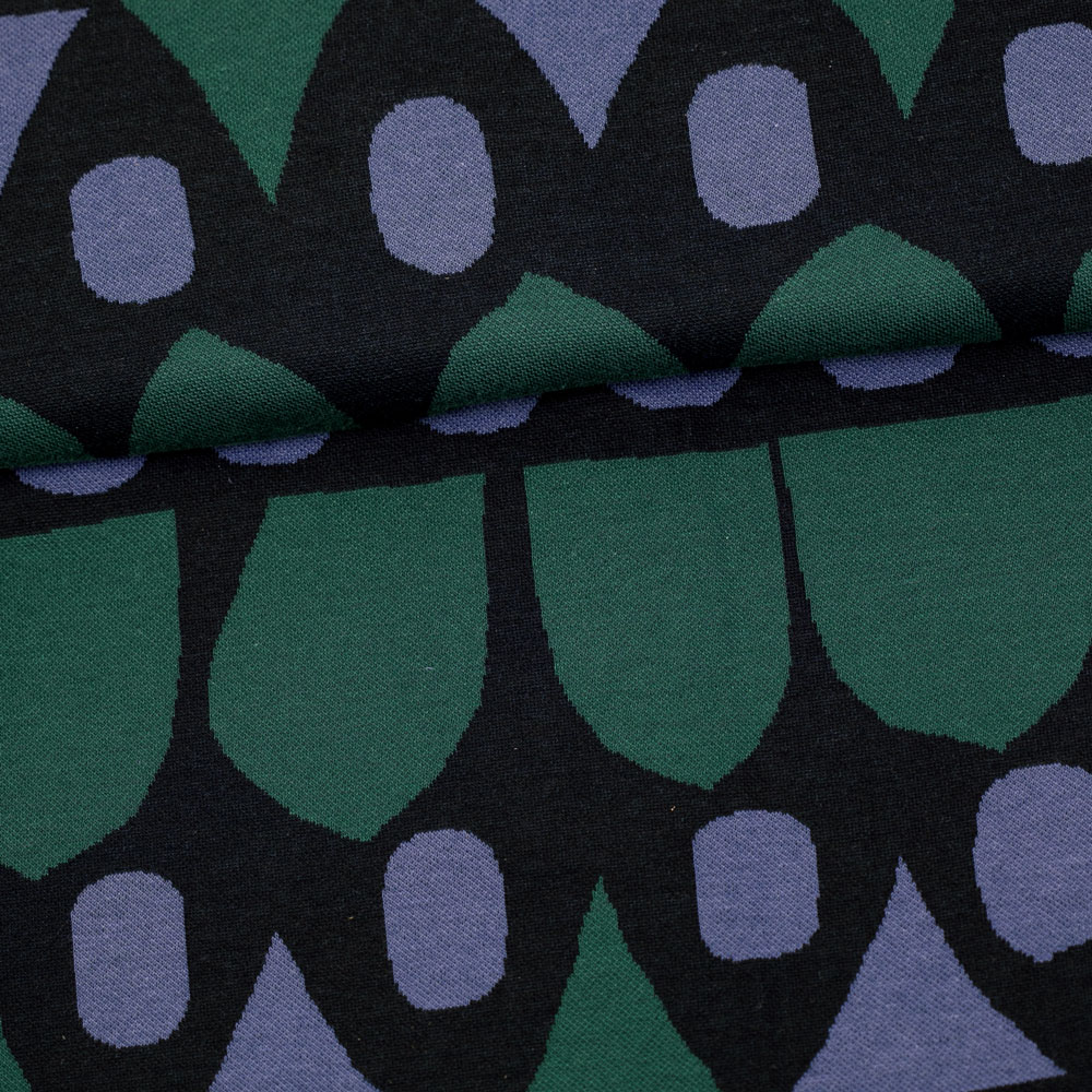 Paapiin tummanvihreän ja mustikansinisen värinen jacquardneulos, jossa geometrinen kuvio. Kuvion on luonut Anniina Isokangas.