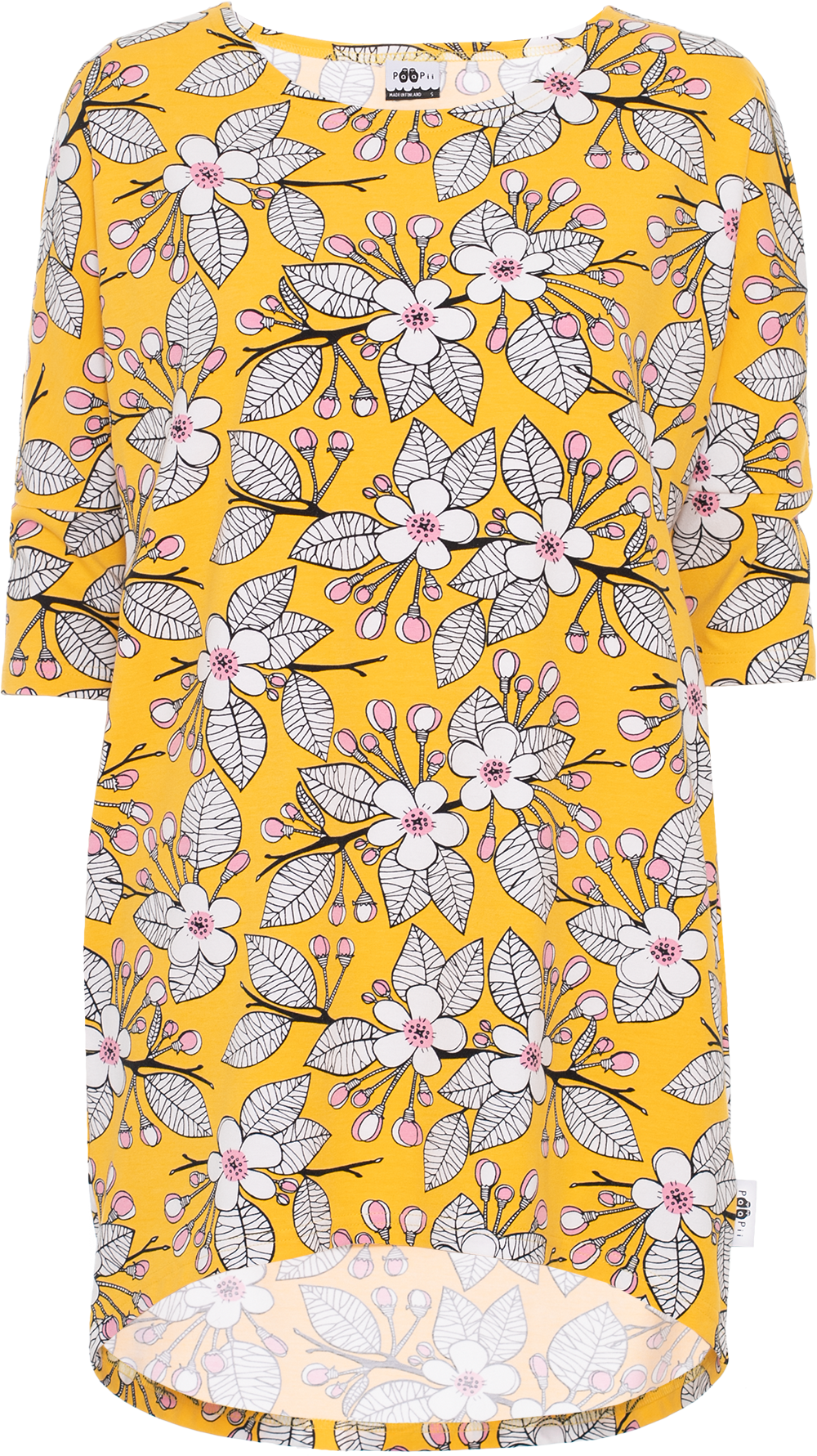 PaaPiin auringon värinen naisten paita. PaaPiin kotimainen naisten paita on malliltaan väljä ja suora. Paita ulottuu lantion alapuolelle ja sen helma on takaa pidempi. Sivuissa on taskut. Yhdistä Sade -paita esimerkiksi Sorja -legginsien tai Sanni -housujen kanssa.